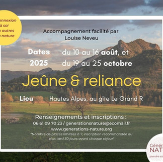 Les dates des nouveaux séjours de jeûne sont maintenant programmées ! Encore de nombreuses occasions pour partager avec vous ces temps de profonde reconnexion et régénération. Dès le mois d'avril, je vous accueille chez mon amie Laure, au Grand R, pour un stage plutôt ouvert à celles et ceux qui n'ont jamais jeûné et/ou qui souhaitent faire une pause et apprendre à prendre soin d'eux ; ce stage d'avril pourra également se faire en monodiète. En août et en octobre, je vous retrouve toujours à Savournon, mais pour des séjours dédiés aux pratiques de reliance. Plusieurs séjours en itinérance sont aussi programmés, avec des courts séjours pour débuter en douceur (monodiète possible aussi), et des stages de six jours d'immersion complète en montagne.